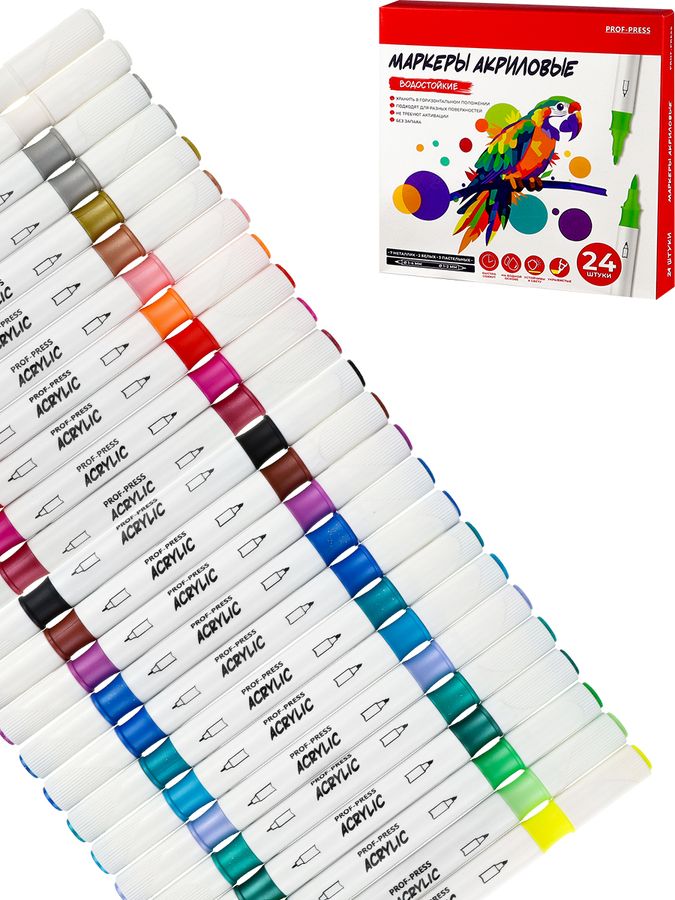 Акриловые маркеры легко адаптируются к различным материалам и обеспечивают высокое качество покрытия и насыщенные цвета, идеальны для любых поверхностей. Набор акриловых маркеров будет превосходным подарком, который наверняка порадует и вдохновит получателя. Этот набор акриловых маркеров подарит удовольствие и радость всем любителям искусства, профессиональным и начинающим художникам, детям и взрослым. Акриловые маркеры представлены в наборе из 24 штук. В комплекте 2 белых цвета и 7 цветов металлика.