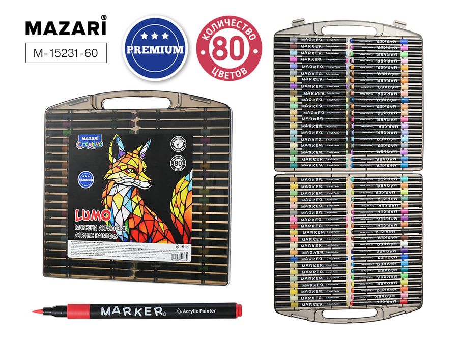 Маркеры акриловые 80цв Lumo кистевид.наконечник пласт.пенал MAZARI M-15231-80
