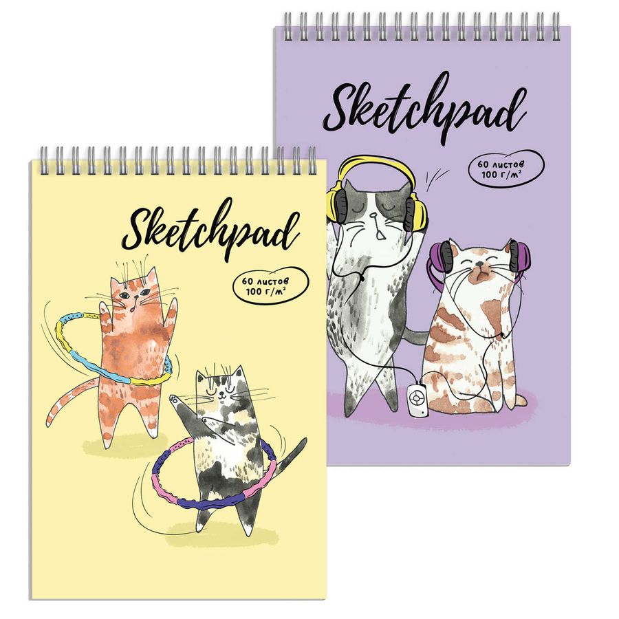 Скетчпад А5 148х210 мм, 60 л, блок - белый офсет 100 г/м2, арт. 59347 ВЕСЕЛЫЕ КОТИКИ /обложка полноцветная печать, твёрдый переплёт на гребне, матовая ламинация,
