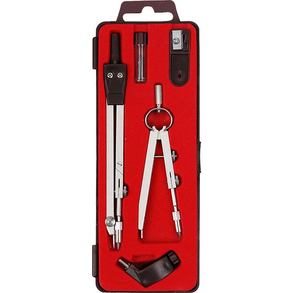 Готовальня "deVENTE" из 5 предметов в пластиковом пенале с европодвесом. Наполнение состоит из: чертёжного циркуля, малого кронциркуля с опцией замены грифеля, насадки с универсальным держателем, точилки для грифеля, и комплекта запасных грифелей. Длина чертёжного циркуля 135 мм. Две металлические ножки и пластиковые элементы (держатель и поворотный узел). На одной несгибаемой штанге игла, на другой, сгибаемой - насадка с механическим карандашом. Максимальный диаметр круга 36 см. Металлические части чертёжных инструментов изготовлены из сплава цинка, а надёжные соединительные механизмы позволяют им выдерживать многократные циклические нагрузки. Готовальня упакована в пластиковый пенал с красным ложементом, прозрачной крышкой и европодвесом для расположения на специальных стойках с навесными крючками.