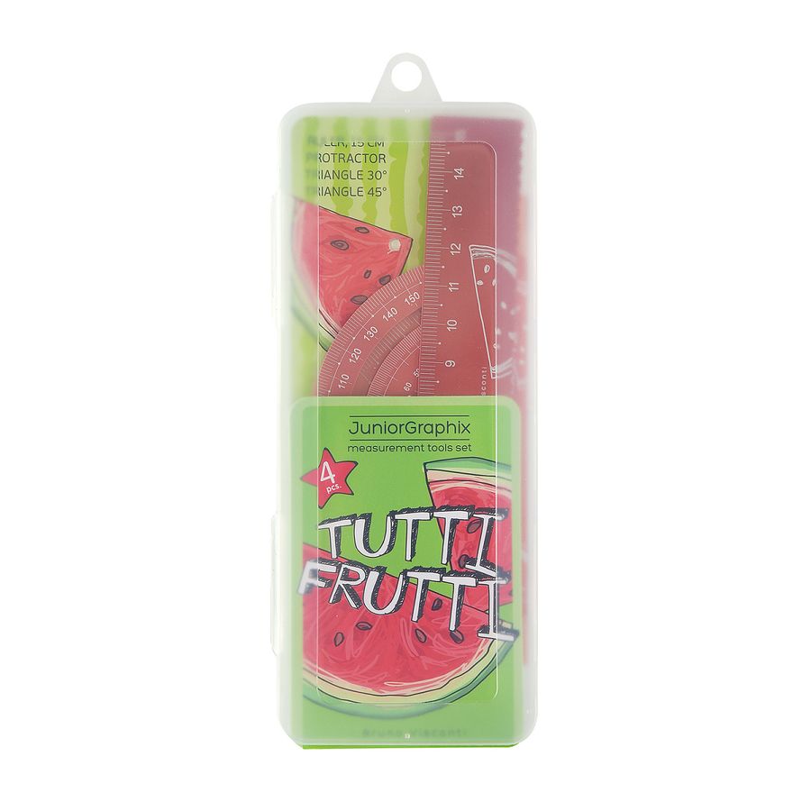Такие забавные принты не могут не поднять настроение, их так и хочется изучать детально. Яркий набор "JuniorGraphix.Арбуз" ТМ Bruno Visconti из 4-х металлических измерительных инструментов в пластиковом пенале: линейка 15 см, прямоугольный треугольник 30°/10 см, равнобедренный треугольник 45°/10 см, транспортир 180°. предназначен для измерения расстояний, построения углов и черчения. Разве можно не порадовать ребенка подобным набором? Учеба должна быть в радость!