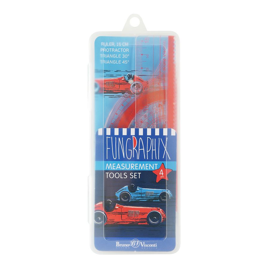 Такие забавные принты не могут не поднять настроение, их так и хочется изучать детально. Яркий набор "CARS" ТМ Bruno Visconti из 4-х измерительных инструментов в пластиковом пенале: линейка 15 см, прямоугольный треугольник 30°/10 см, равнобедренный треугольник 45°/10 см, транспортир 180° в пластиковом футляре. Набор предназначен для измерения расстояний, построения углов и черчения. Разве можно не порадовать ребенка подобным набором? Учеба должна быть в радость!