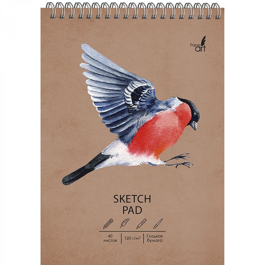 Скетчпад А5 (140х200), 40л. Евроспираль по короткой стороне. Обл.: крафт картон, выборочный лак, жесткая подложка. Бум.120 г/м2, без печати Снегирь Скетчбук Paper Art формата 140*200 мм необходим каждому творческому человеку! Невероятно практичный формат, твердая обложка, плотная бумага 120 г/м2 и возможность использовать разные художественные техники. Перфорация на каждом листе позволяет без повреждения рисунка оторвать нужный лист.