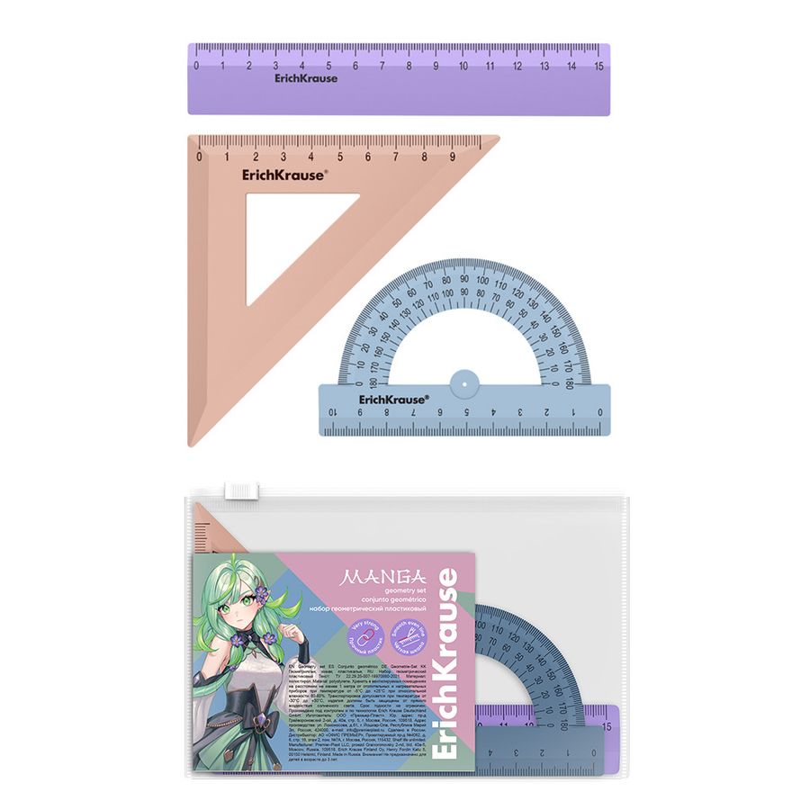Набор геометрический непрозрачный из высококачественного пластика. В комплекте 3 предмета: линейка с односторонней шкалой 15см – фиолетовый, угольник 45°/9см – бежевый, транспортир 180°/10см – голубой.