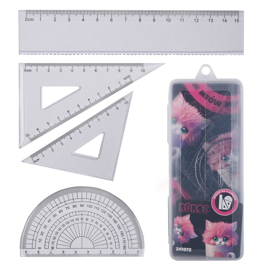 Набор геом. 4пр. малый треугольники 2шт+линейка+транспортир Кот в кружке прозрачный Кокос 241072