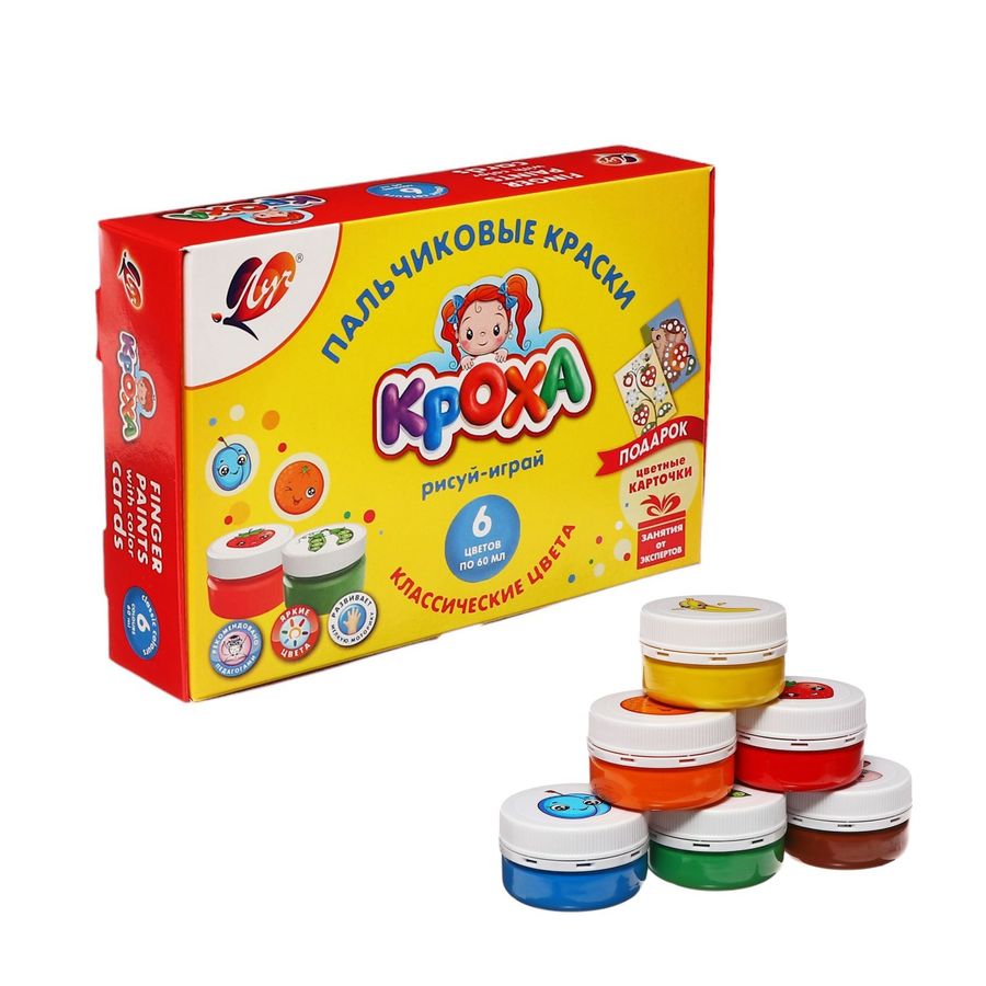 Пальчиковые краски ЛУЧ серии "Кроха" разработаны специально для маленьких детей, которым ещё сложно рисовать кисточкой или карандашами. Краски обладают особой густой консистенцией, благодаря которой, при рисовании, они не капают и не разбрызгиваются. Ими можно рисовать на бумаге или картоне, как пальчиками, так и при помощи губки или кисточки. А еще их можно взять в ванную и рисовать на плитке перед купанием малыша. Рисование пальчиками развивает мелкую моторику, цветовосприятие, образное мышление и фантазию ребенка. В наборе 6 цветов краски: зеленый, синий, коричневый, красный, оранжевый желтый, которые легко смешиваются между собой для получения новых оттенков, а так же в набор добавлены 2 карточки-раскраски. Краски легко смываются с тела ребенка, одежды и мебели. Безопасный состав. Объем каждой баночки 60 мл. Крышка с контрольным кольцом.
