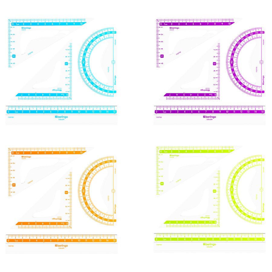 Набор чертёжный большой Berlingo серии Color прозрачный. В него входят: линейка пластиковая 30 cм, треугольник пластиковый 30°-60 °, 20 см, треугольник пластиковый 45°-45 °, 8 см, линейка-транспортир пластиковая 180 °. Пакет с европодвесом .