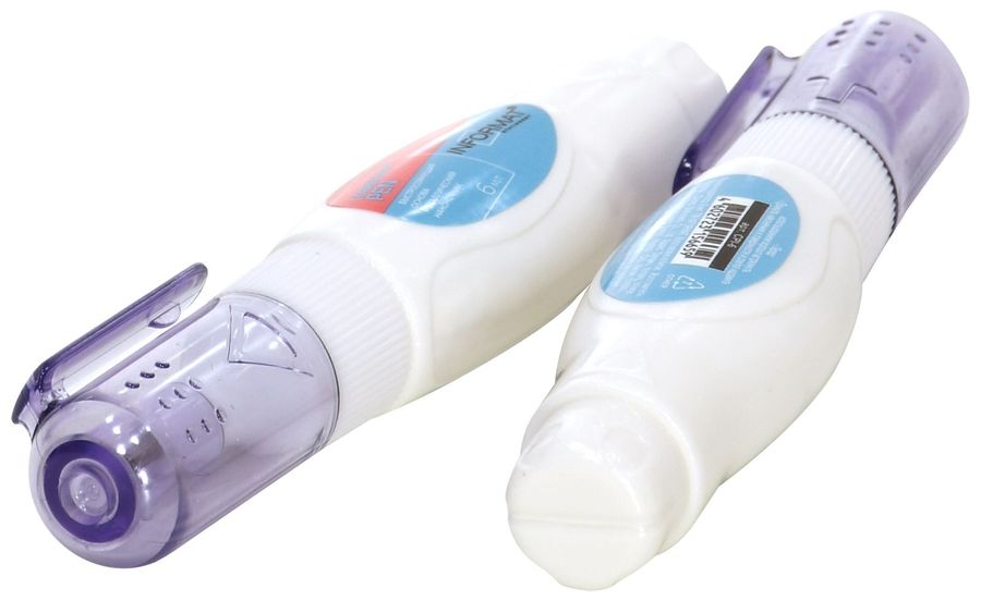 Корректирующая ручка INFORMAT полностью безопасна в применении, универсальна, подходит для коррекции любых чернил и любого вида бумаги (включая факсовую). Имеет удобную эргономичную форму корпуса. Корректирующая жидкость, используемая в ручке, ложится ровным гладким слоем, создает непрозрачное покрытие. Сохнет за 30—35 секунд.