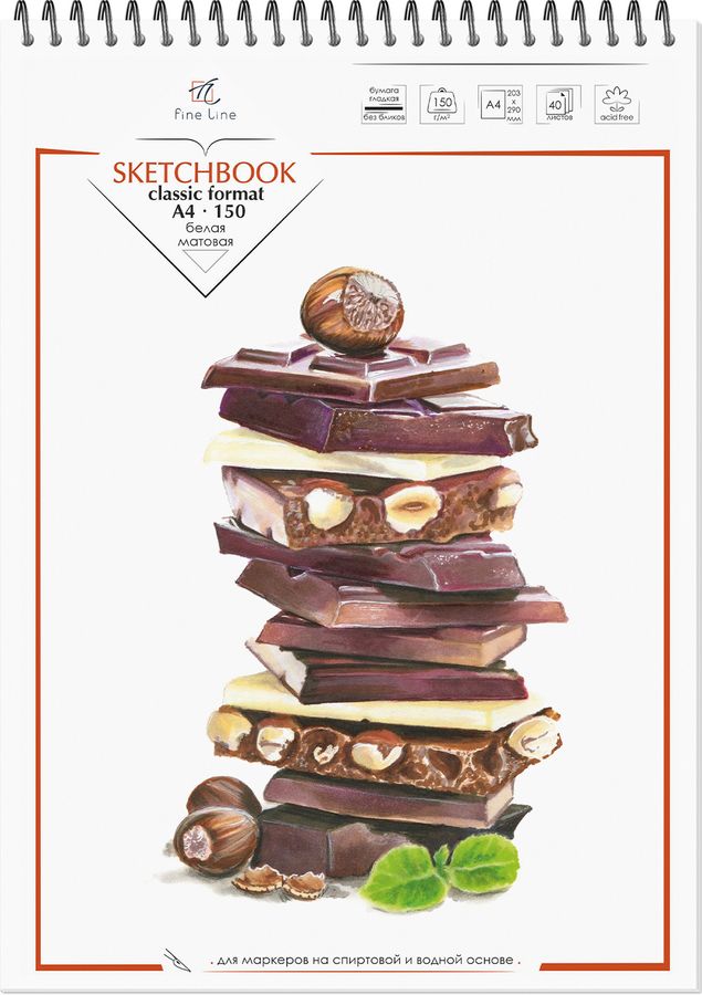 Блокнот-скетчбук Fine Line Classic Format формат А4 для спиртовых маркеров, 40л., на гребне: блок - бумага для маркеров специальная, плотность 150 г/квм; обложка - мелов. картон (имп.), матовое лакирование, жесткая подложка, мет. гребень сверху.