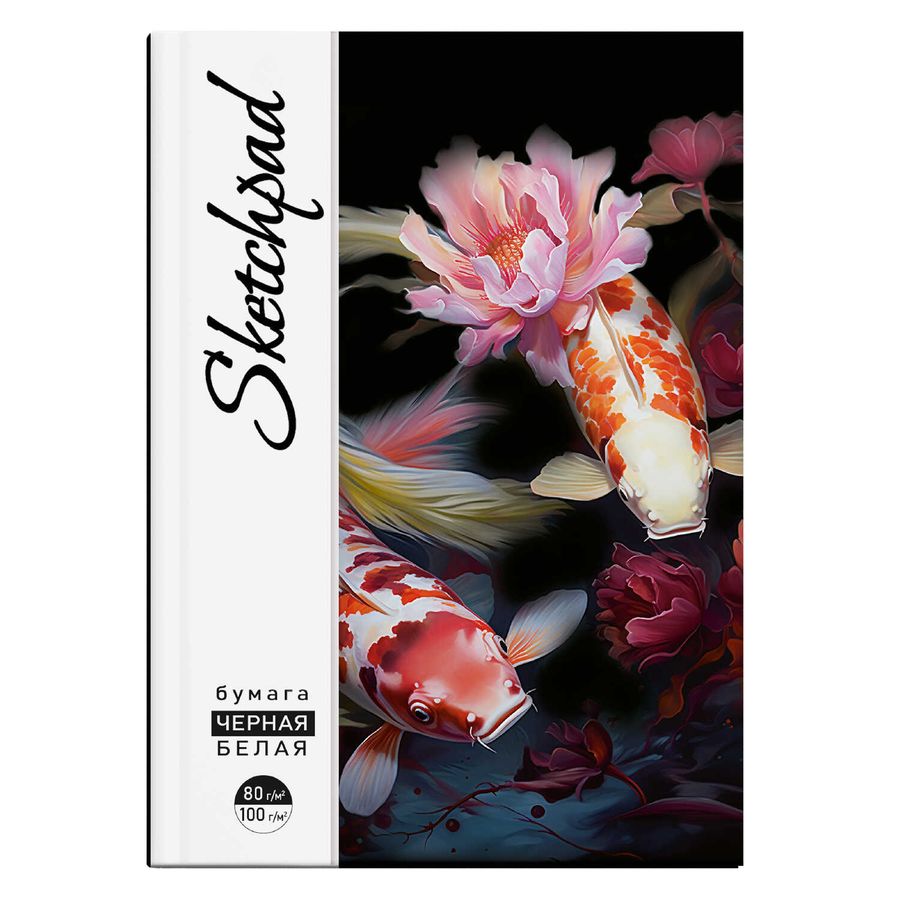 Скетчпад. КАРПЫ КОИ. Формат: А5. Количество листов - 48 л. Тип обложки: твёрдый переплёт. Цвет внутреннего блока - белый офсет, чёрный офсет. Плотность бумаги 100 г/м², 70 г/м². Обложка: полноцветная печать. Ламинация обложки - матовая ламинация.