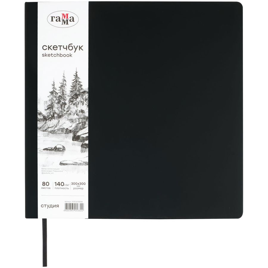Скетчбук «ГАММА» размером 300*300 мм идеален для эскизов, набросков, скетчинга, записей. Подойдёт как для художников, дизайнеров, так и для студентов, школьников.Внутренний блок состоит из 80 листов высококачественной бумаги белого цвета плотностью 140 г/м2. Походит для рисования разными материалами: карандашами, линерами, пастелью, графитом, ручками и другими. Тип скрепления – сшивка.Лаконичный, компактный размер и жёсткая обложка с эффектом soft-touch обеспечивает удобство зарисовок на прогулке или в путешествии. Цвет обложки – чёрный. Закладка-ляссе помогает быстро открыть скетчбук на нужной странице, а эластичная резинка предотвращает листы от замятия и случайного открытия.Скетчбук удобно брать в путешествие, на прогулку или пленэр. Автор иллюстрации на амбалажной ленте - Александра Подушкина. Индивидуальная упаковка в термоусадочную плёнку.• Размер: 300*300 мм;• Количество листов: 80;• Тип скрепления: сшивка;• Внутренний блок: рисовальная бумага;• Плотность блока: 140 г/м2.