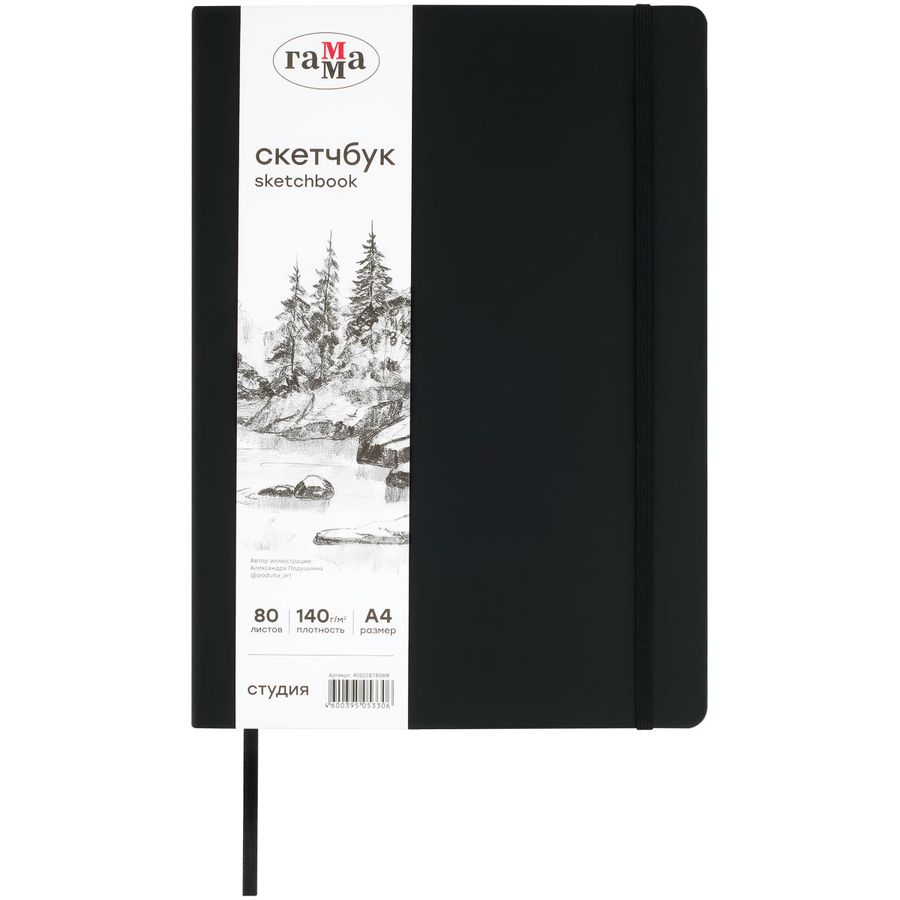 Скетчбук «ГАММА» формата А4 идеален для эскизов, набросков, скетчинга, записей. Подойдёт как для художников, дизайнеров, так и для студентов, школьников.Внутренний блок состоит из 80 листов высококачественной бумаги белого цвета плотностью 140 г/м2. Походит для рисования разными материалами: карандашами, линерами, пастелью, графитом, ручками и другими. Тип скрепления – сшивка.Лаконичный, компактный размер и жёсткая обложка с эффектом soft-touch обеспечивает удобство зарисовок на прогулке или в путешествии. Цвет обложки – чёрный. Закладка-ляссе помогает быстро открыть скетчбук на нужной странице, а эластичная резинка предотвращает листы от замятия и случайного открытия. Автор иллюстрации на амбалажной ленте - Александра Подушкина. Индивидуальная упаковка в термоусадочную плёнку.• Формат: А4;• Количество листов: 80;• Тип скрепления: сшивка;• Внутренний блок: рисовальная бумага;• Плотность блока: 140 г/м2.