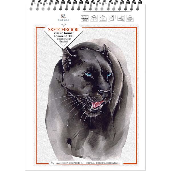 Блокнот для зарисовок , формат A4, 12 листов, обложка – мелованный картон (имп.), матовое лакирование, блок – бумага акварельная 100% хлопок 300 г/квм , металлический гребень, жесткая подложка.