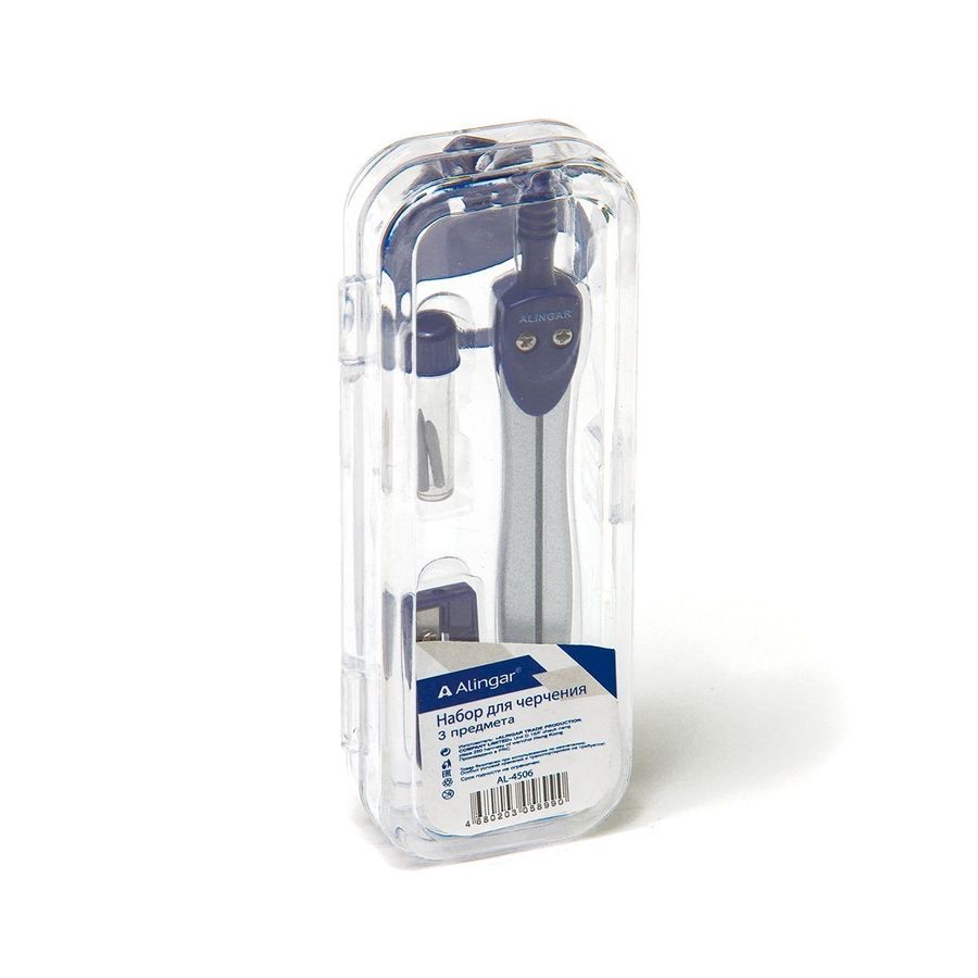 Набор чертежных принадлежностей из 3 предметов включающий в себя: металлический циркуль с пластиковым держателем, точилка для грифеля, запасной грифель в контейнере. Одним из важнейших характеристик является качество крепления подвижных частей циркуля — фиксирующие болты. Предназначен для школьников старших классов, студентов, специалистов, архитекторов и конструкторов.