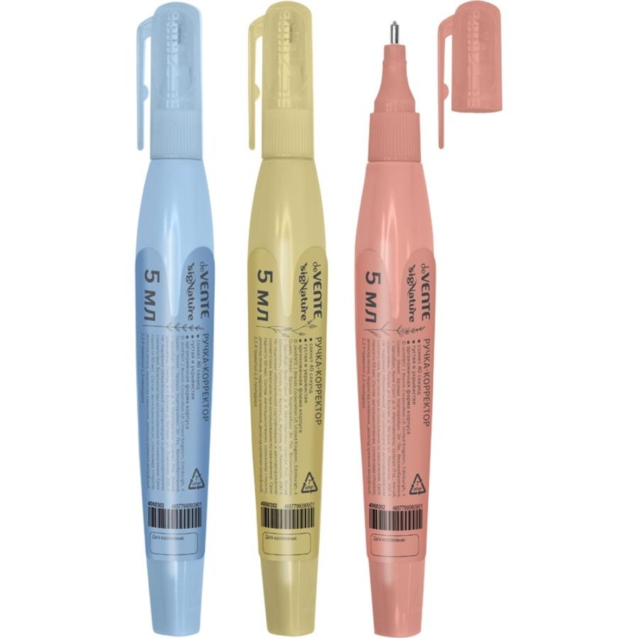 Ручка-корректор "deVENTE. sigNATURE" 05 мл, с эргономичным корпусом, быстросохнущая, трубчатая система подачи, цвета корпуса ассорти (оливковый, пудрово-розовый, сумеречный синий), в картонном дисплее с пластиковым поддоном