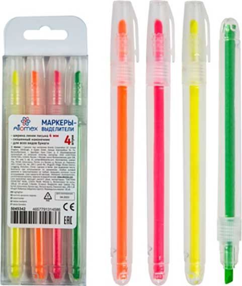 Набор маркеров-выделителей "Attomex" (04 цв - желт, зел, оранж, роз) круглый корпус, скошенный наконечник, ширина линии 1-4 мм, в ПВХ коробке с европодвесом.