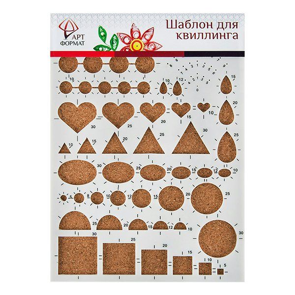 "Предназначен для создания фигур из скрученных в спирали полосок бумаги для квиллинга. Шаблон представляет собой пластиковую доску с ячейками различной формы – кругами, сердечками, квадратами, треугольниками, каплями, овалами, а также с пробковым основанием, на котором удобно фиксировать спирали булавками, придавая им нужную форму. "
