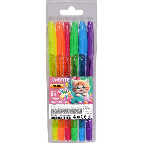 Набор ручек шариковых "deVENTE. Candy Cat" 06 цветов, d=0,7 мм, с полупрозрачным корпусом и металлическим наконечником, сменный стержень, в пластиковом блистере.