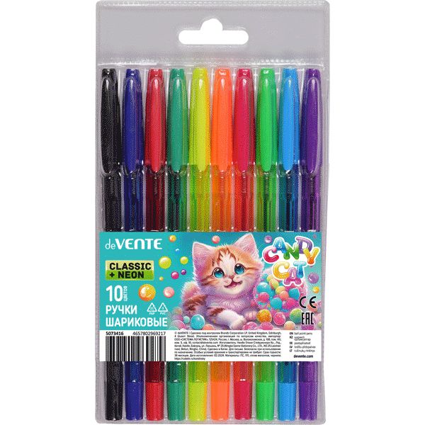 Набор ручек шариковых "deVENTE. Candy Cat" 10 цветов, d=0,7 мм, с полупрозрачным корпусом и металлическим наконечником, сменный стержень, в пластиковом блистере.