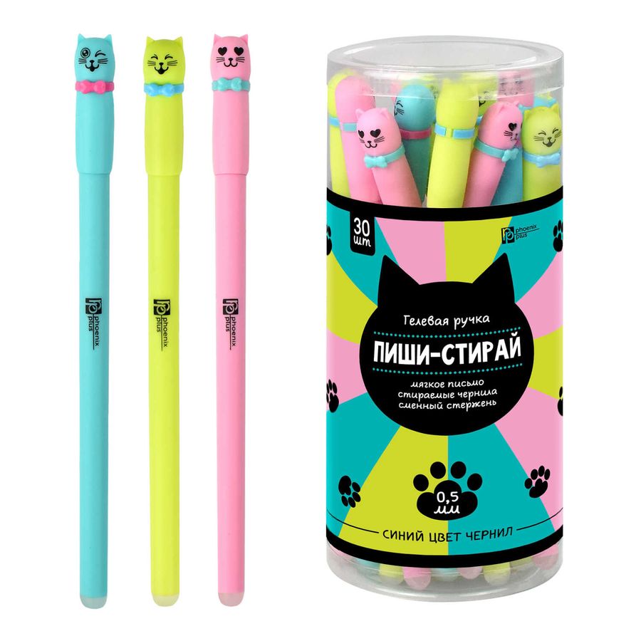 Ручка гелевая ПИШИ-СТИРАЙ арт. 57852 / 30 МИЛЫЕ КОТЫ (ПВХ тубус, 30 шт., ассорти, неавтоматическая, 8х150 мм, цвет корпуса: голубой, зелёный, розовый, материал корпуса: пластик, покрытие корпуса: софт-тач, стираемые чернила, фигурный колпачок из пластика, 0,5 мм, цвет чернил: синий, стержень: сменный).