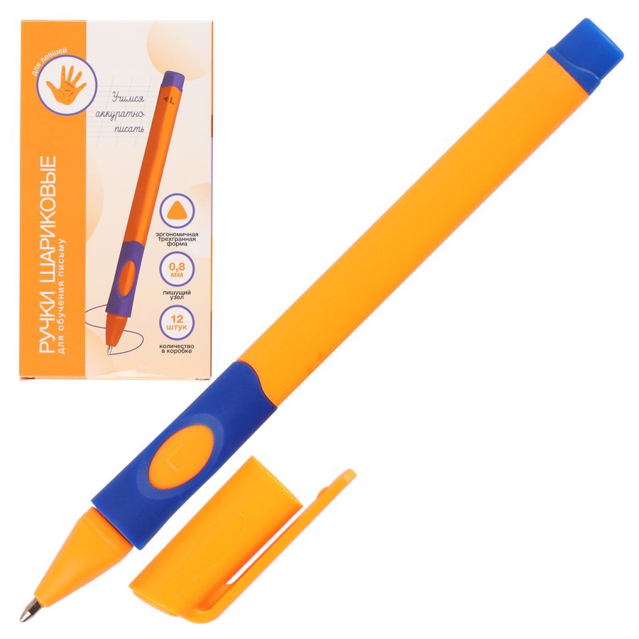 Ручка шариковая для левшей синяя 0,8мм Обучение письму оранжевый трехгран.корпус Кокос 231619