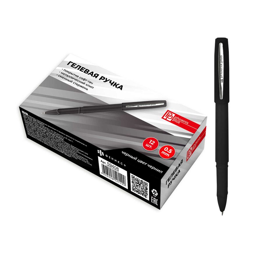 Ручка гелевая арт. 59408 / 12 МЕТАЛЛИЧЕСКИЙ КЛИП (картонный короб, 12 шт., неавтоматическая, 12х140 мм, цвет корпуса: чёрный, материал корпуса: пластик, покрытие корпуса: софт-тач, гравировка на клипе, 0,5 мм, цвет чернил: черный, стержень: сменный).