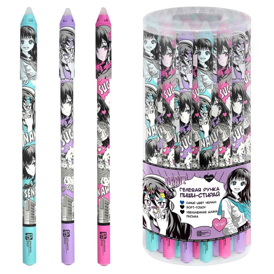 Ручка гелевая ПИШИ-СТИРАЙ арт. МАНГА (ПВХ тубус, 30 шт., ассорти, неавтоматическая, мм, цвет корпуса: голубой, розовый, сиреневый, материал корпуса: АБС-пластик, покрытие корпуса: софт-тач, стираемые чернила, 0,5 мм, цвет чернил: синий, стержень: сменный). #АНИМЕ