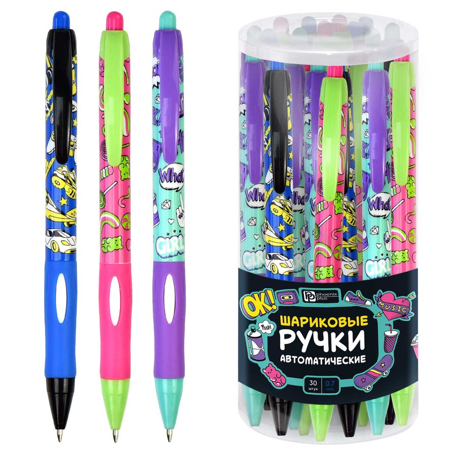 Ручка шариковая арт. 61379 / 30 ГОНКИ, МАРМЕЛАД И ХОББИ (ПВХ тубус, 30 шт., ассорти, автоматическая, механизм ручки: нажимной, 10х140 мм, цвет корпуса: голубой, розовый, синий, материал корпуса: полиметилметакрилат, покрытие корпуса: глянцевое непрозрачное, 0,7 мм, цвет чернил: синий, стержень: сменный).