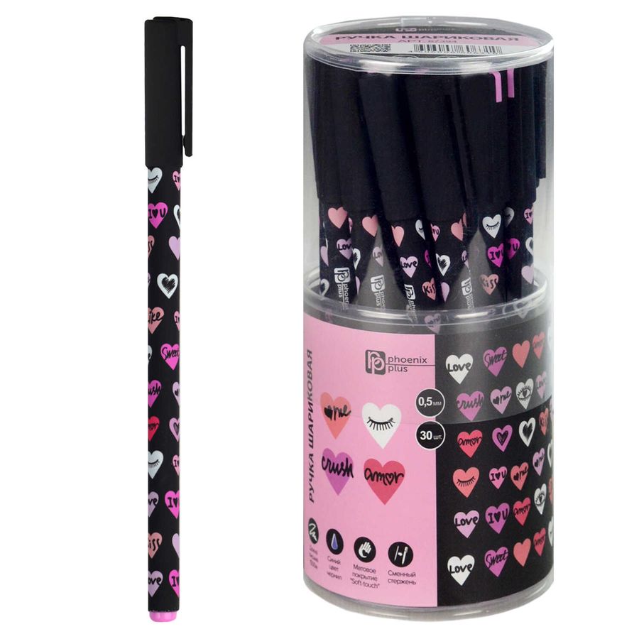 Ручка шариковая арт. 67394 / 30 СЕРДЕЧКИ (ПВХ тубус, 30 шт., неавтоматическая, 7x150 мм, цвет корпуса: черный, розовый, материал корпуса: АБС-пластика с добавлением САН-пластика, покрытие корпуса: софт-тач, 0,5 мм, цвет чернил: синий, стержень: сменный).