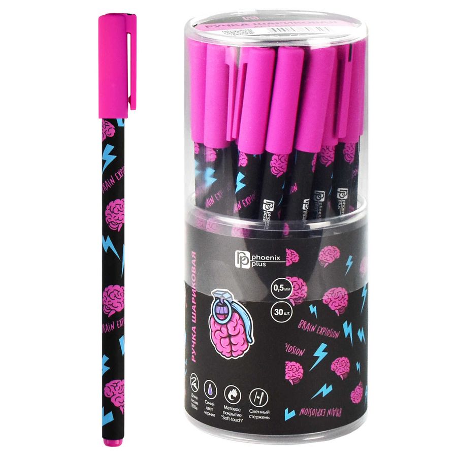 Ручка шариковая арт. 67422 / 30 ВЗРЫВ МОЗГА (ПВХ тубус, 30 шт., неавтоматическая, 7x150 мм, цвет корпуса: черный, розовый, синий, материал корпуса: АБС-пластика с добавлением САН-пластика, покрытие корпуса: софт-тач, 0,5 мм, цвет чернил: синий, стержень: сменный).