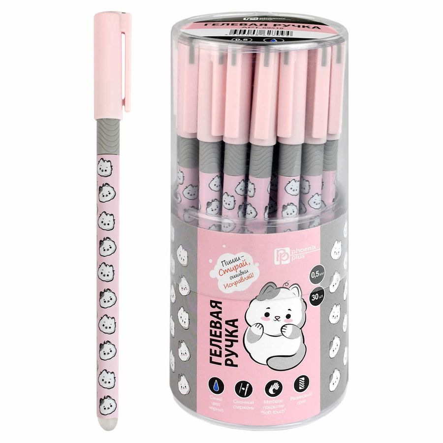 Ручка гелевая ПИШИ-СТИРАЙ арт. 69518 / 30 КОТИКИ НА РОЗОВОМ (ПВХ тубус, 30 шт., неавтоматическая, 7x152 мм, цвет корпуса: серый, розовый, материал корпуса: АБС-пластик с добавлением САН-пластика, покрытие корпуса: софт-тач, стираемые чернила, 0,5 мм, цвет чернил: синий, стержень: сменный).