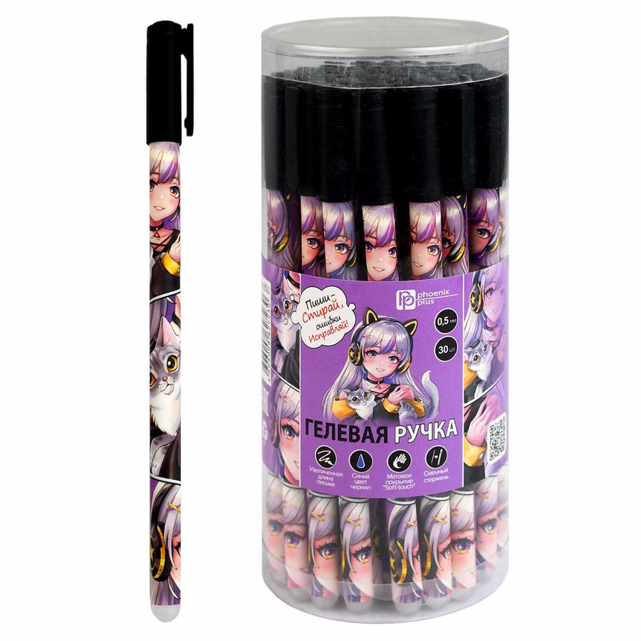 Ручка гелевая ПИШИ-СТИРАЙ арт. 69532 / 30 МАЛЫШКА В НАУШНИКАХ (ПВХ тубус, 30 шт., неавтоматическая, 8х148 мм, цвет корпуса: фиолетовый, черный, материал корпуса: АБС-пластик, покрытие корпуса: софт-тач, стираемые чернила, 0,5 мм, цвет чернил: синий, стержень: сменный).