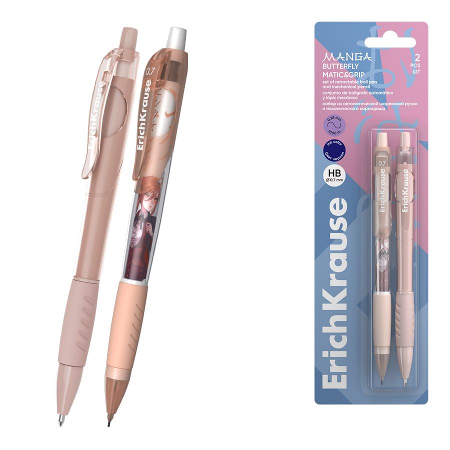 Автоматическая шариковая ручка Matic&Grip со стандартным типом пишущего узла. Ручка имеет глянцевый круглый корпус цветов коллекции Manga с комфортной профилированной грип-зоной из резины. 5-канальный пишущий узел с диаметром шарика 0.7 мм в сочетании с чернилами пониженной вязкости обеспечивает мягкое и быстрое письмо без усилий. Длина непрерывной линии составляет 1000 м при толщине 0.28 мм, что является одним из лучших показателей в своей категории. Механический карандаш круглой формы с удобной грип-зоной из резины. Четыре дизайна корпуса. Оснащен ластиком. Твердость HB. Диаметр грифеля – 0.7 мм.