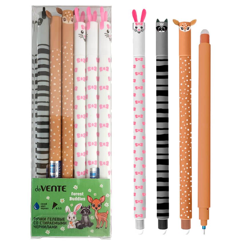 Ручка гелевая стираемая "deVENTE. Forest Buddies" d=0,5 мм, корпус с эффектом Velvet-Touch, цвета корпуса ассорти 3 цвета, с декоративными элементами и запечаткой на колпачке и корпусе, с ластиком, см 5051542