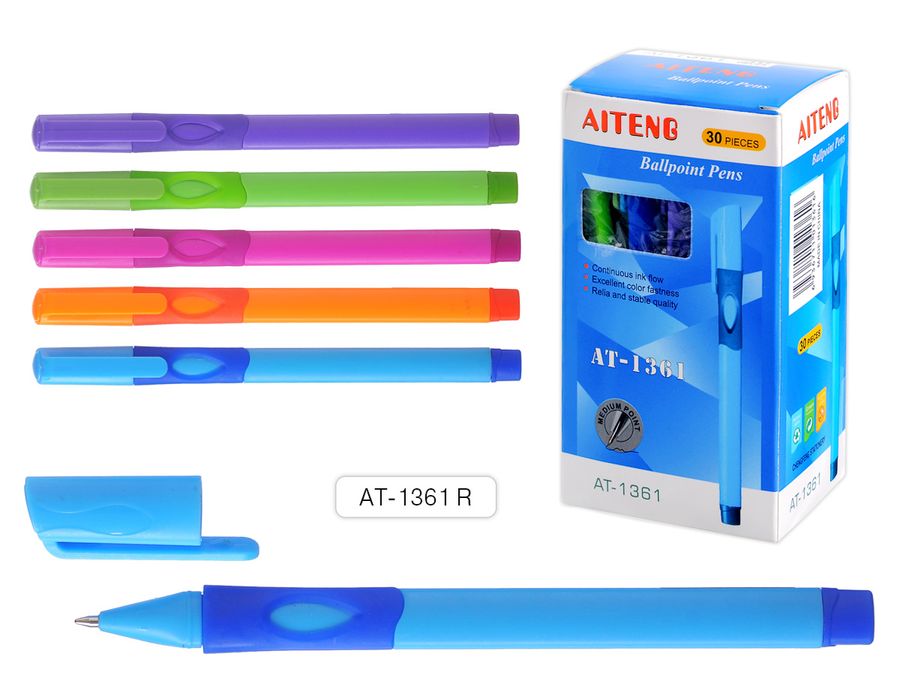Ручка шариковая СИНЯЯ, для ПРАВШЕЙ, пулевидный пиш.узел 0.7мм, корпус пластиковый трехгранный, ассорти 5 цветов, с резиновым грипом, картонная упаковка