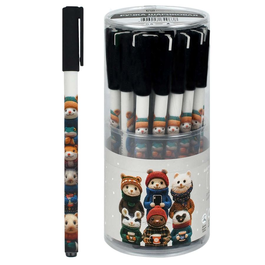 Ручка шариковая арт. 71666 / 30 ВЯЗАНЫЕ ЗВЕРИ (ПВХ тубус, 30 шт., неавтоматическая, 7x150 мм, цвет корпуса: коричневый, чёрный, материал корпуса: АБС-пластик с добавлением САН-пластика, покрытие корпуса: софт-тач, 0,5 мм, цвет чернил: синий, стержень: сменный).