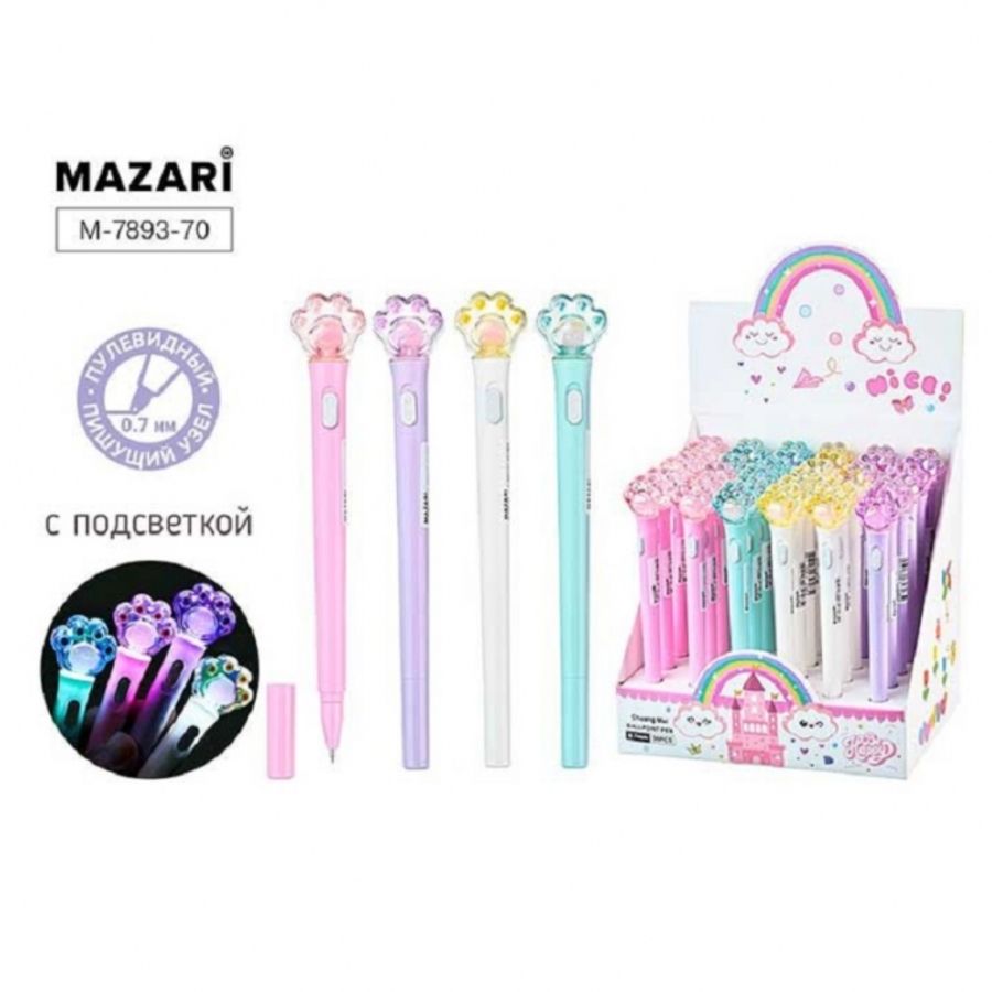 Ручка шар. детская MAZARI синяя 0,7мм Лапки, с подсветкой, пулевид. пиш.узел 0,7мм, корпус пластик., смен. стержень 98мм
