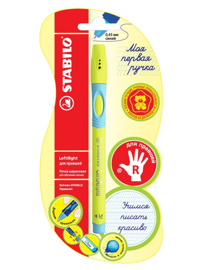 Шариковая ручка STABILO LeftRight разработана немецкой компанией STABILO совместно со специалистами в области медицины и образования специально для обучения письму детей дошкольного и младшего школьного возраста. Эксперты по эргономике подтвердили использование ручки STABILO LeftRight с “подсказкой” для пальцев позволяет быстрее и легче сформировать правильный навык держать пишущий инструмент, четкий читаемый почерк и предотвращает напряжение и усталость руки ребенка во время письма. Специально для правшей: дизайн ручки адаптирован под манеру письма правшей. Ручка обеспечивает легкое и мягкое письмо практически без нажима и более высокую скорость письма благодаря чернилам пониженной вязкости и технологии Hi-Flux. Сменный стержень. Дополнительно Артикул сменного стержня: 1597718