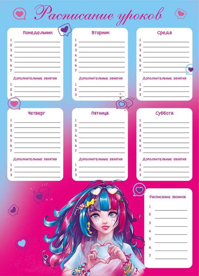 Расписание уроков арт. 63556/ 50 РОМАНТИЧНАЯ ДЕВУШКА , А3, полноцветная печать, выборочный УФ-лак, мелованный картон 230 г/м²/