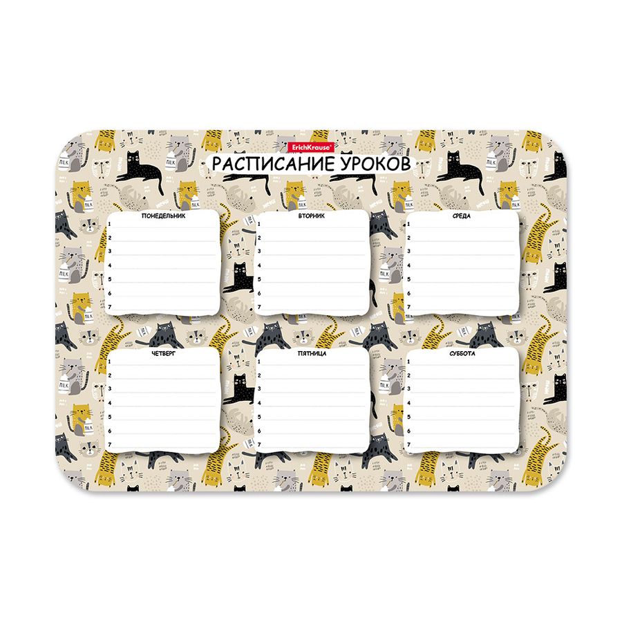 Расписание уроков формата А4 (210х297 мм) из высококачественного пластика. Поверхность подходит для многократного написания простыми и цветными карандашами, фломастерами, любыми не перманентными маркерами. Толщина пластика — 0.4 мм. Шестидневная учебная неделя, каждый день содержит строки для записи. Упаковка — индивидуальный пакет.