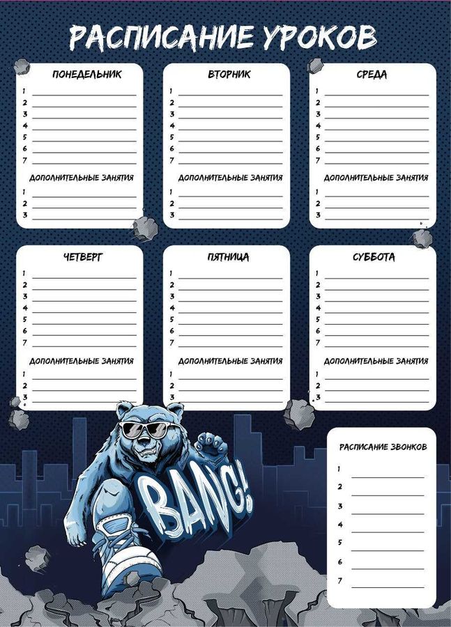 Расписание уроков арт. 63557/ 50 КРУТОЙ ГРИЗЛИ , А3, полноцветная печать, выборочный УФ-лак, мелованный картон 230 г/м²/