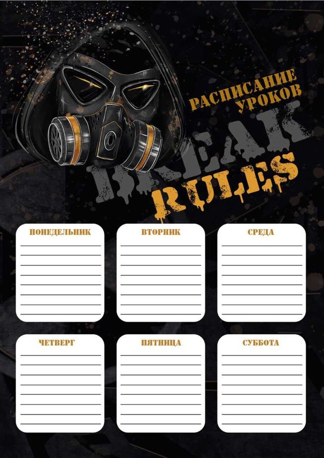 Расписание уроков А4, арт.63539/К/ 50 ТЕМНЫЙ РАЙТЕР (210x297 мм, материал: мелованный картон 235 г/м², полноцветная печать, декор: выборочный УФ-лак; цвет: чёрный, серый, жёлтый; индивидуальная упаковка: нет)