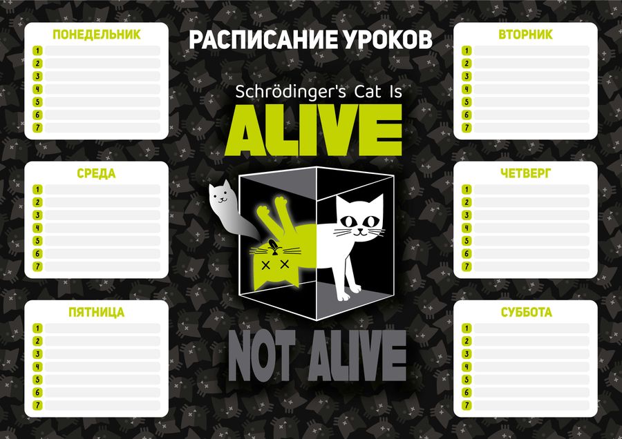 Расписание уроков А4, арт.63550/К/ 50 НАУЧНЫЙ КОТ (210x297 мм, материал: мелованный картон 235 г/м², полноцветная печать, декор: выборочный УФ-лак; цвет: чёрный, салатовый, белый; индивидуальная упаковка: нет)