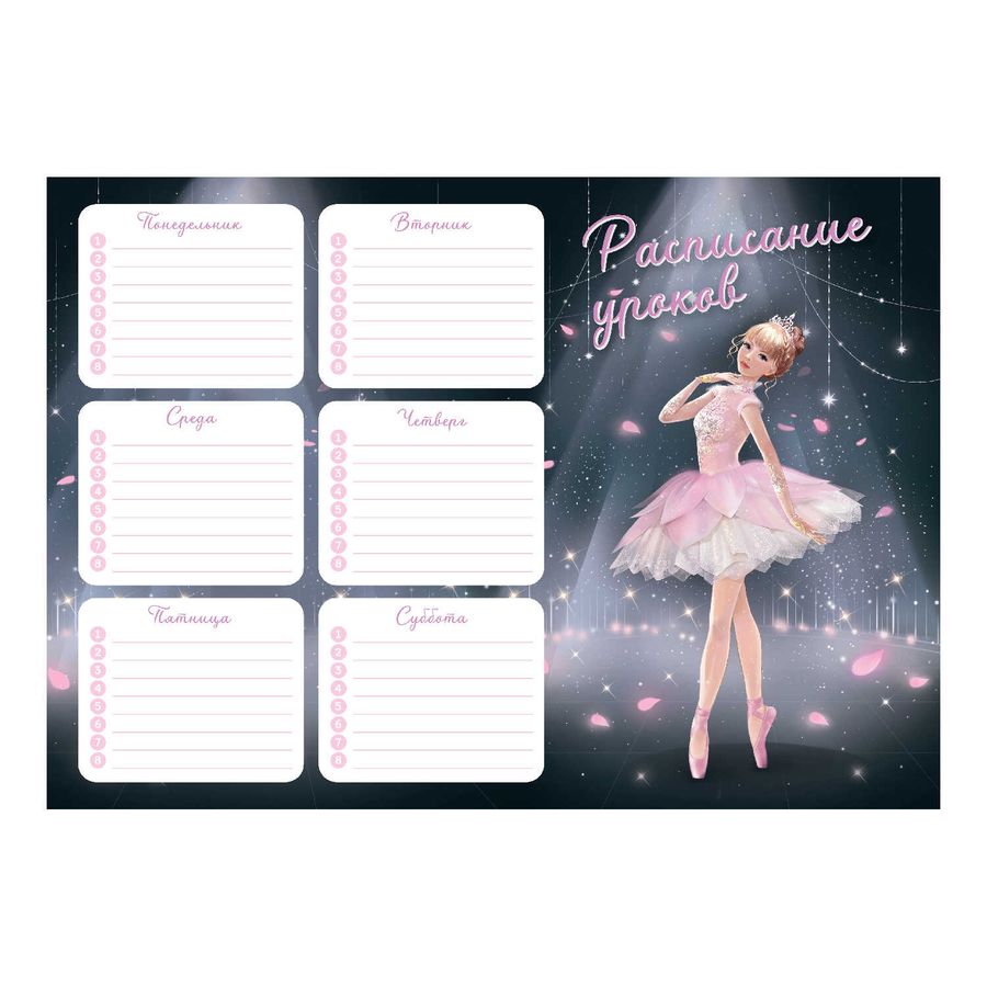 Расписание уроков А4, арт. 67654/ 50 БАЛЕРИНА (210x297 мм, материал: мелованный картон 235 г/м², полноцветная печать, декор: выборочный УФ-лак; цвет: белый, розовый, чёрный; индивидуальная упаковка: нет)