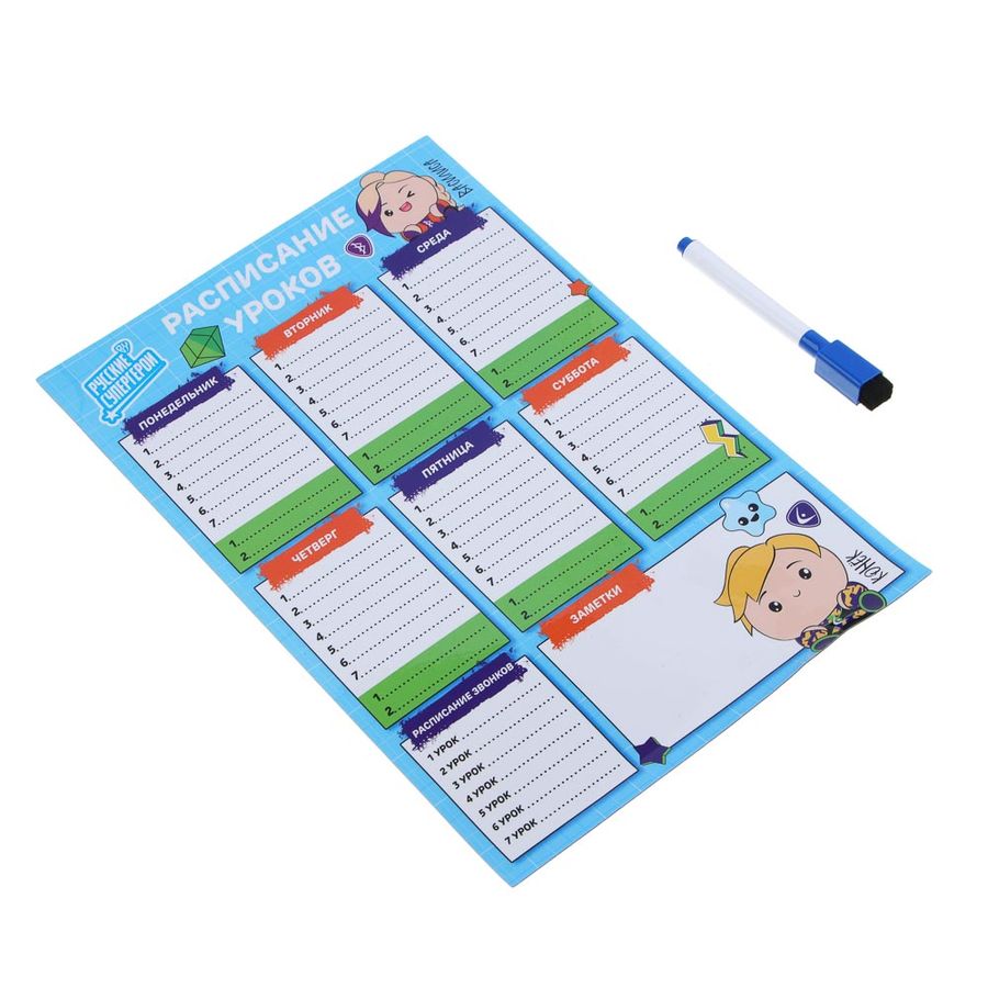 Расписание уроков от BY Русские Супергерои «Кавай» на гибком магнитном основании – это удобный планер формата А4 для школьника на 6 дней недели. В него можно вписать 7 уроков на каждый день и 2 дополнительных занятия, что актуально для тех, кто посещает кружки и секции. Предусмотрено поле для заполнения расписания звонков и пустое поле для заметок. Кроме того, в комплекте идет маркер со стирателем. Использование такого планшета дисциплинирует ребенка, учит его самостоятельности. Расписание можно разместить на письменном столе, на холодильнике или на магнитно-маркерной доске.
