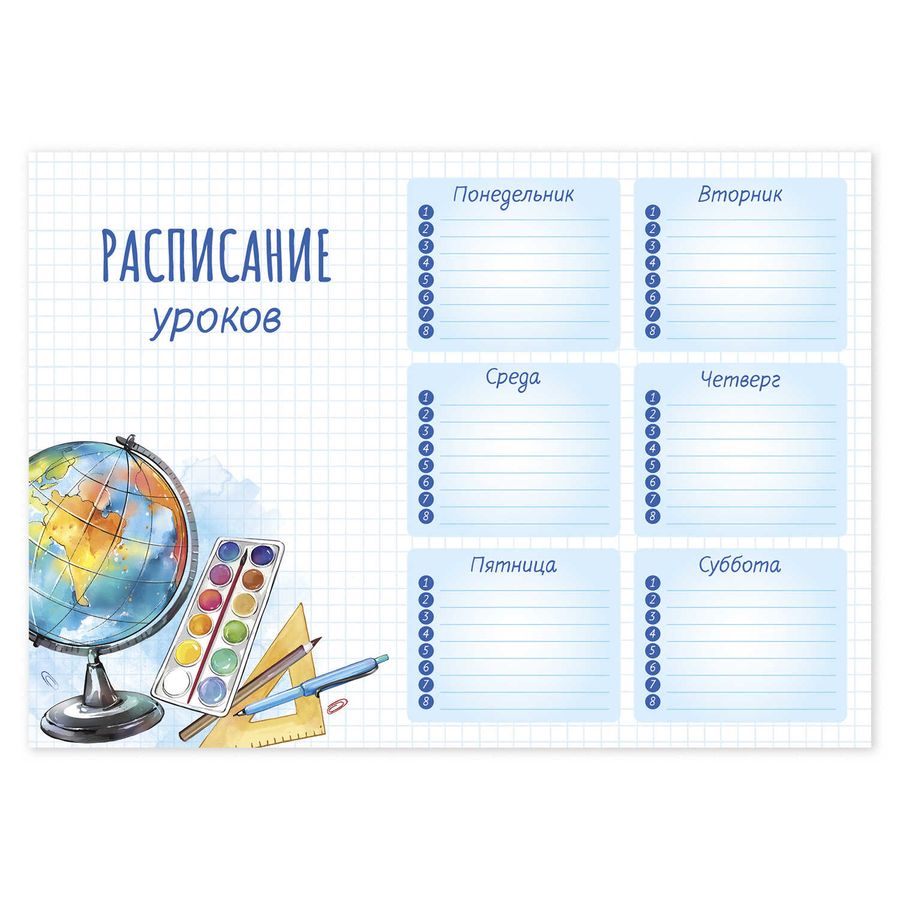 Расписание уроков А4, арт. 68849/ 50 ГЛОБУС (210x297 мм, материал: мелованный картон 235 г/м², полноцветная печать, декор: выборочный УФ-лак; цвет: голубой, белый; индивидуальная упаковка: нет)