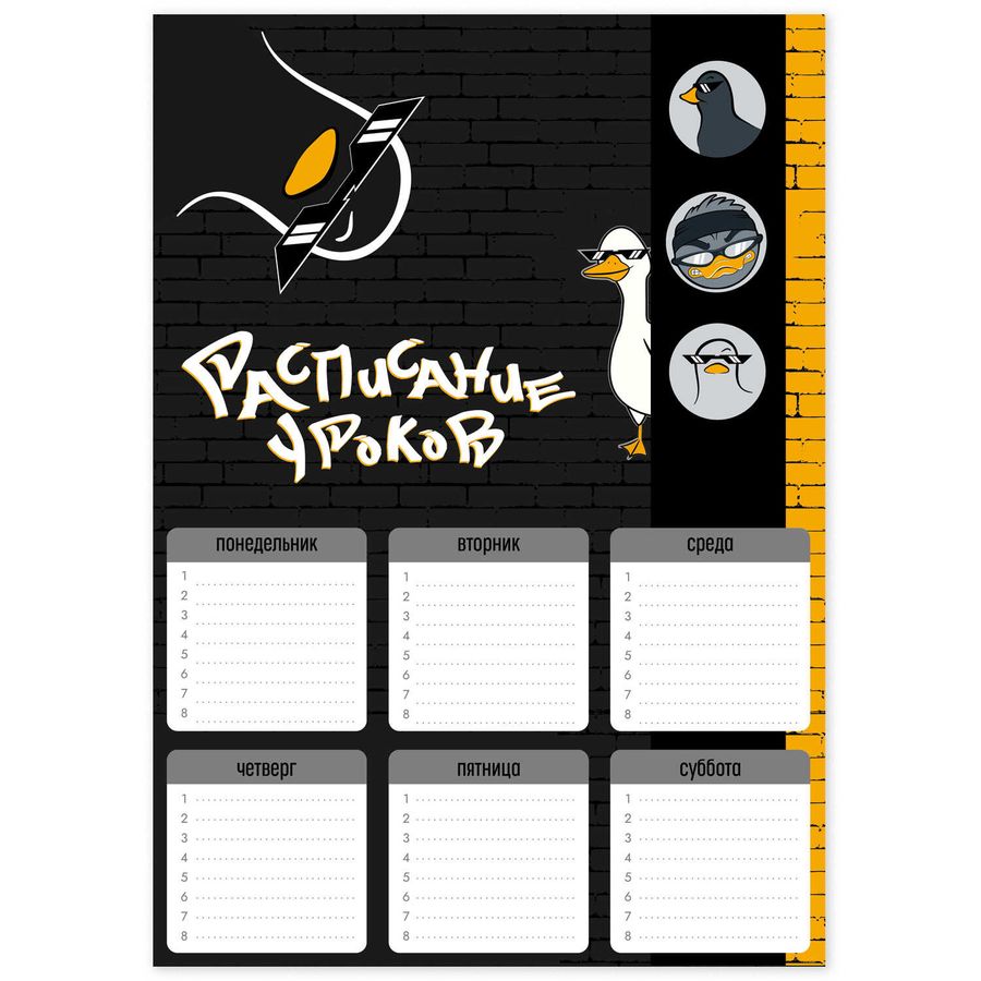 Расписание уроков А4, арт. 68858/ 50 КРУТОЙ УТЕНОК (210x297 мм, материал: мелованный картон 235 г/м², полноцветная печать, декор: выборочный УФ-лак; цвет: белый, жёлтый, чёрный; индивидуальная упаковка: нет)