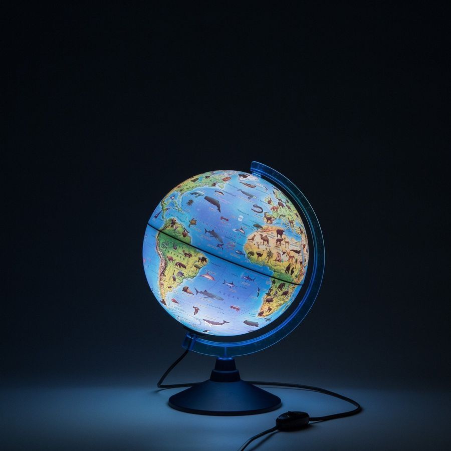 Зоогеографический интерактивный глобус Globen INT12500306 - это находка для тех, кто хочет привить свои детям интерес к изучению географию и животного мира нашей планеты. Немного необычный глобус дает возможность путешествовать по миру, не выходя из комнаты. И дарит очень большое количество интересной и познавательной информации. Возможно это благодаря функции 3D AR Технология, которая позволяет подключить глобус к планшету или смартфону. Направив камеру смартфона на глобус, вы сможете увидеть на экране представителей флоры и фауны, обитателей морей и океанов, все чудса света и новые открытия археологов, горы и пустыни, достопримечательности разных стран. Интересно и весело с помощью маленьких помощников-путешественников Ариши, Мити, Темы, их кошки Ириски и пса Астора глобус поведает об известных и малоизвестных фактах из жизни нашей планеты и ее истории. Ваш ребенок сможет проникнуть в недра Земли, чтобы узнать, как выглядит ядро планеты, изучать Космос, путешествовать по планете. Процесс изучения окружающего мира будет проходить нескучно, а потому вся новая информация будет усавиваться значительно лучше и быстрее. Интерактивный глобус теперь дополнен и виртуальной реальностью (VR-очки идут в комплекте). Активировав в меню функцию VR и надев VR-очки, ребенок сможет почувствовать себя астронавтом в открытом космосе, участником настоящего квеста или путешествия-игры. И всё это - сидя на удобном диване. Приложение постоянно пополняется новой информацией и новыми возможностями. Чтобы активировать их необходимо следить за одновлениями. Полное большое обновление ожидается в мае месяце. Глобус без использования приложения становится хорошим учебным пособием для детей дошкольного и младшего школьного возраста. Изготовлен из пластика - и сфера, и подставка. Диаметр сферы 25 см. На физическю карту нанесены изображения животных в местах, соответствующих их ореолу обитания. Сама физическая карта выполнена с полным соблюдением масштаба.