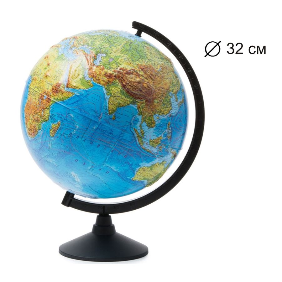 Загляните в захватывающий мир географических открытий с этим школьным помощником. Глобус физический 320 мм рельефный GLOBEN, это увлекательный, удобный и доступный для наблюдения мир, как страничка в учебнике. Развивайте пространственное мышление, касаясь и разглядывая каждую деталь этой тактильной Земли. Узнайте о политическом и физическом мире с его рельефной поверхностью, которая придает особый шарм изучению географии. С этим незаменимым принадлежным для школьников глобусом физической карты мира от GLOBEN Ваш ребенок не только блеснет знаниями о нашей планете, но и окунется в интересное учебное приключение. От Атлантики до Арктики, от Южной Америки до Австралии - все это можно узреть и изучить прямо у себя дома. Величественные контуры на поверхности глобуса будут вдохновлять юного путешественника на новые открытия. Неповторимый рельефные формы создадут ощущение полного immersion (погружения) в мировое сообщество. Настоящая уменьшенная модель Земли прямо у вас на столе! Большой физический глобус станет незаменимым пособием для изучения географии, а также развития у детей пространственного мышления. Благодаря подробной физической карте с надписями на русском языке ребенок с легкостью выучит основные географические объекты и сможет блеснуть знаниями на уроке. Физический глобус с рельефной поверхностью – это необычный и полезный подарок. Рельеф позволяет буквально почувствовать под пальцами горы и низины. Глобусы часто закупают для кабинетов, школьных классов и библиотек. Данная большая модель на прочной разборной подставке подойдет для детской комнаты, прекрасно впишется в любой интерьер. Сфера изготовлена из пластика. Диаметр сферы 32 см. Устойчивая настольная подставка из пластика синег оцвета. Карта максимально подробная для данного диаметра глобуса. Линия экватора выпуклая для тактильно восприятия. Карта физическая. Изоборажение карты соответсвует принятым мировым картографическим стандартам условного обозначения ландшафта и стран. Подарочная упаковка - фирменная картонная коробка.