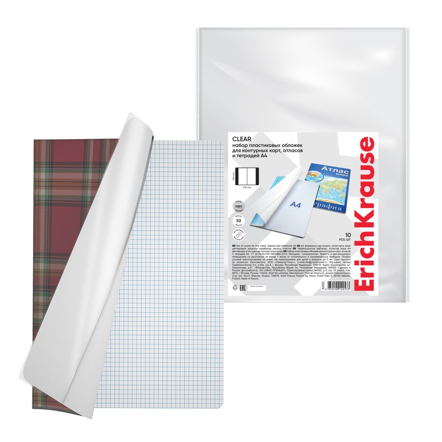 Набор обложек из высококачественного прозрачного пластика с особо прочными швами и текстурой поверхности "апельсиновая корка", на которой не видно отпечатков пальцев и мелких царапин. Надежно защищают тетради от повреждений. Размер - 306х426мм, толщина - 0.05мм. Гарантированно подходит для продукции ErichKrause®. Код и баркод на каждой единице товара.
